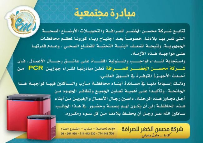 وفي منشور رصده "يمن برس" أعلنت شركة محسن الخضر للصرافة على صفحتها في فيس بوك، استعدادها لشراء جهازين PCR كدعم انساني مقدم منها للقطاع الصحي في المحافظة.