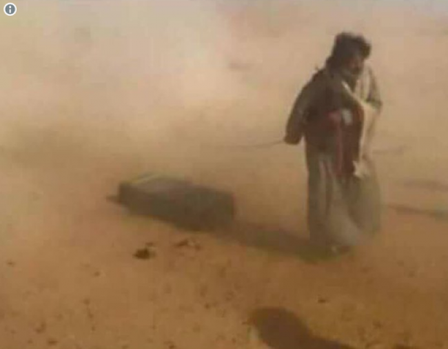ويبدو العكيمي في الصورة وهو يجر خلفة صندوق ذخيرة