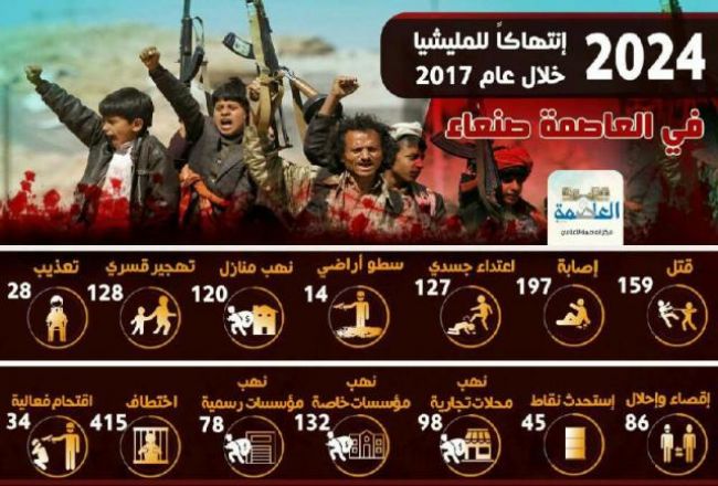 كشفت وحدة الرصد بمركز العاصمة الاعلامي عن (2024) انتهاك وجريمة ارتكبتها ميليشيات الحوثي بالعاصمة صنعاء خلال العام المنصرم 2017م، تنوعت بين (27) انتهاك تبدأ بالانتهاكات المعتقلة بالإنسان (قتل