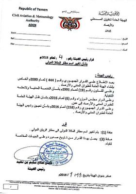 وأصدر رئيس هيئة الطيران المدني صالح سليم بن نهيد، قرارا بتغيير اسم مطار المكلا الدولي الى مطار