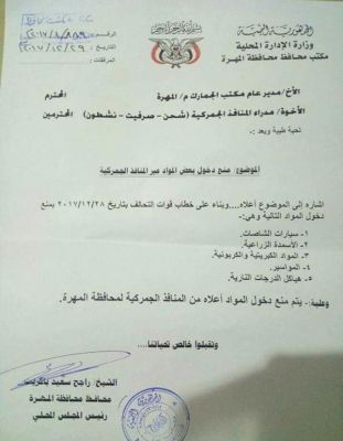 منعت الحكومة اليمنية دخول سيارات الشاص ومواد أخرى عبر منافذ محافظة المهرة مع سلطنة عمان .
