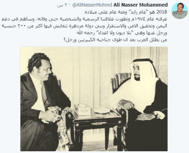 غرد الرئيس اليمني الأسبق علي ناصر محمد على صفحته بمنصة التدوينات المصغر تويتر قبل قليل قائلاً: