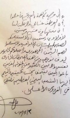 كتب الرئيس اليمني السابق علي عبدالله صالح، رسالة بخط يده وتضمنت وصية لأولاده وللشعب اليمني.