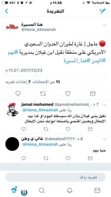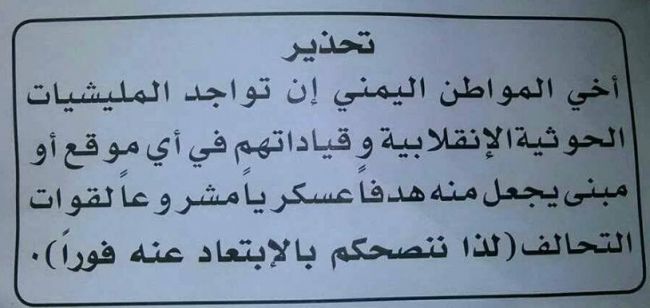 حذرت طائرات التحالف العربي المواطنين والمواطنات في اليمن من الاقتراب من أماكن الحوثيين وتجمعاتهم .