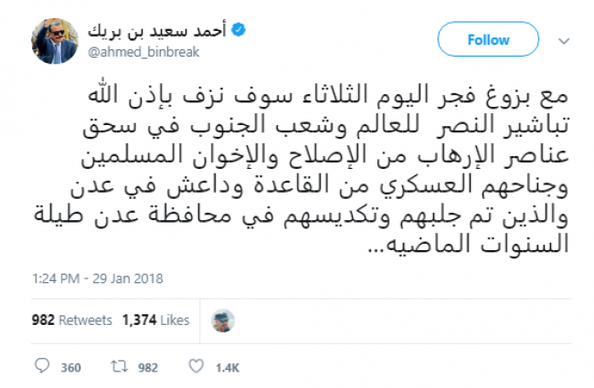 أعلن رئيس الجمعية الوطنية الجنوبية في المجلس الإنتقالي الجنوبي، اللواء أحمد سعيد بن بريك عن إنتصار قوات المجلس الإنتقالي الجنوبي على قوات الإصلاح والإخوان وجناحهم العسكري في عدن