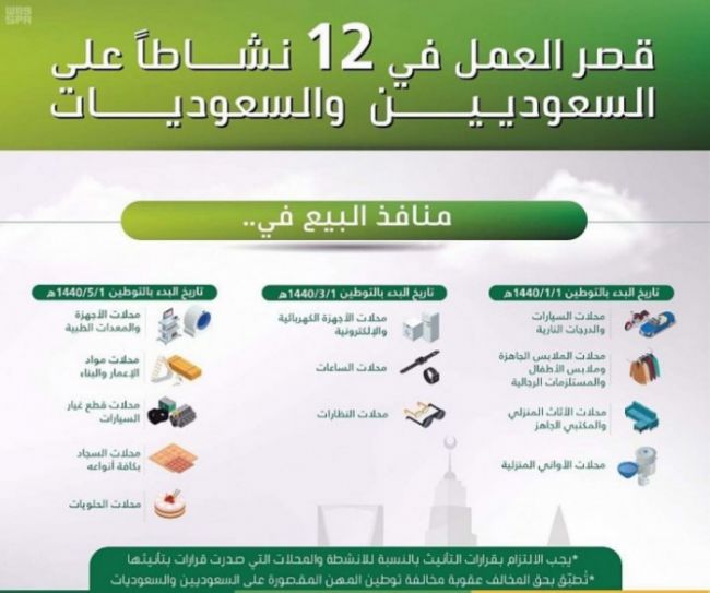 صدر قرار وزاري في المملكة العربية السعودية يقضى بسعودة وتوطين 12 مهنة داخل محلات البيع، ويسرى القرار الجديد بداية من العام الهجري المقبل. وأصدر وزير العمل والتنمية الاجتماعية علي بن ناصر