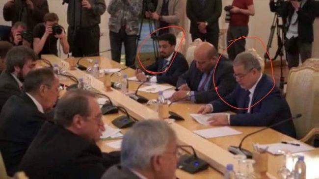 وظهر وزير الخارجية عبدالملك المخلافي وبجواره نجله أسامة خلال المباحثات التي أجريت مع الجانب الروسي بموسكو يوم أمس
