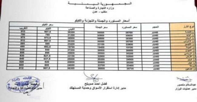 نشر مكتب الصناعة والتجارة في مدينة عدن - جنوب اليمن - قائمة جديدة بأسعار مادة الأرز بعد تعديلها نتيجة تعافي أسعار صرف الريال اليمني مقابل عملة الاستيراد ( الدولار ).