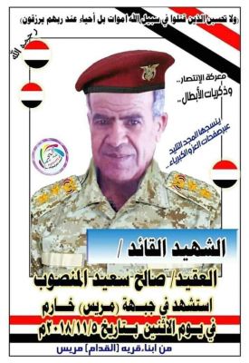 نعت منظمة الحزب الاشتراكي اليمني بمديريه مريس استشهاد العقيد صالح سعيد المنصوب والذي استشهد امس الاول وهوا يؤدوي واجبه الوطني في الدفاع عن الارض والعرض في جبهه مريس