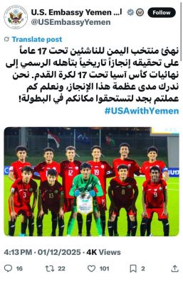 في لفتة تعكس اهتمامًا دوليًا بإنجازات الرياضة اليمنية، هنّأت سفارة الولايات المتحدة الأمريكية في اليمن منتخب اليمن للناشئين بعد تأهله التاريخي إلى نهائيات كأس آسيا تحت 17 عامًا، وذلك عبر حسابها الرسمي على منصة X.