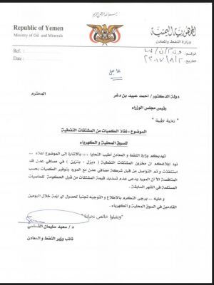 رفع نائب وزير النفط والمعادن الدكتور سعيد سليمان الشماسي ببرقية عاجلة الى رئيس الوزراء احمد عبيد بن دغر يبلغه فيه بنفاذ الكميات من المشتقات النفطية بالسوق المحلية .