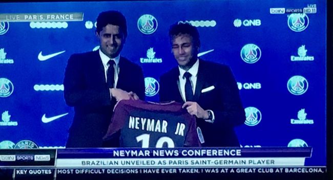 قدم القطري ناصر الخليفي رئيس نادي باريس سان جيرمان الفرنسي، نجم الفريق الجديد البرازيلي نيمار (25 عاما)، القادم من برشلونة الإسباني في مؤتمر صحفي، اليوم الجمعة.