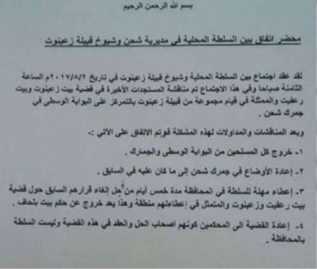 أنهت السلطة المحلية في محافظة المهرة – شرق اليمن – سيطرة مسلحين من قبيلة زعنبوت على منفذ شحن الحدودي مع سلطنة عمان , في وقت اكدت مصادر محلية عدم انسحاب القوات الحكومية من المنفذ او