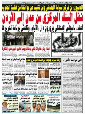 عاودت صحيفة الأيام الصدور من العاصمة المؤقتة عدن بعد عامين من التوقف . وكشفت في عددها الصادر امسعن خطة حكومية لنقل البنك المركزي اليمني من عدن إلى العاصمة الأردنية عمان. ونقلت الصحيفة عن