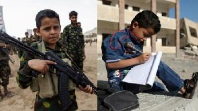 نشرت قناة العربية صورتان لطفلين يمنيين الأول جندته جماعة الحوثي رغم صغر سنه والثاني يكتب الواجب المدرسي وهو جالس بين أنقاض مدرسته التي دمرها قصف الميلشيا.