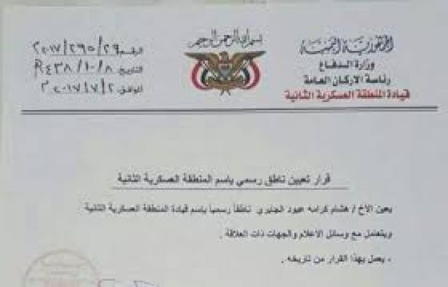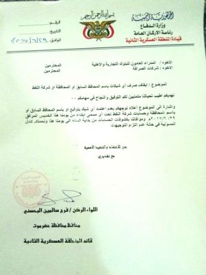 وجه محافظ حضرموت الجديد اللواء الركن فرج بن سالمين البحسني جميع البنوك والمصارف بعد اعتماد أي شيك بتوقيع أو باسم المحافظ السابق أحمد بن بريك في حسابات المحافظة أو شركه النفط.