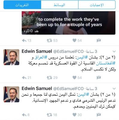 قال إدوين سموأل، المتحدث باسم الحكومة البريطانية في الشرق الأوسط وشمال إفريقيا ان اليمن تمثل تحدي للجميع وأنه لايمكن ترك اليمنيين وحدهم.