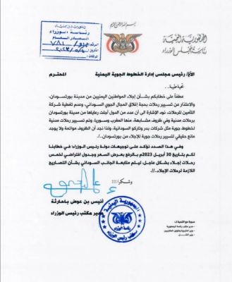 رفض مكتب رئيس الوزراء اعذار شركة الخطوط الجوية "اليمنية" وحججها بشأن اجلاء العالقين في السودان والتي