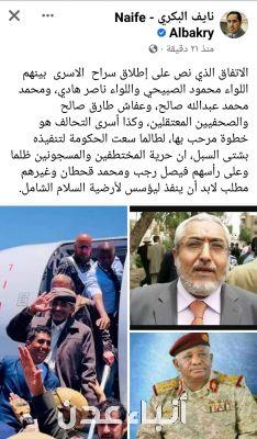 الاتفاق الذي نص على إطلاق سراح الاسرى بينهم اللواء محمود الصبيحي واللواء ناصر هادي، ومحمد محمد عبدالله صالح، وعفاش طارق صالح والصحفيين المعتقلين، وكذا أسرى التحالف هو خطوة مرحب بها، لطالما