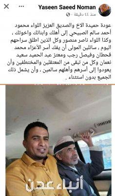 عودة حميدة الاخ والصديق العزيز اللواء محمود أحمد سالم الصبيحي إلى أهلك وابنائك واخوتك ، وكذا اللواء ناصر منصور وكل الذين اطلق سراحهم اليوم ، سائلين المولى أن يفك أسر الأعزاء محمد قحطان وفيصل