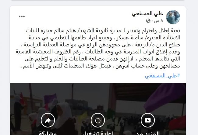 تحية إجلال واحترام وتقدير لـ مديرة ثانوية الشهيد/ هيثم سالم حيدرة للبنات الاستاذة القديرة/ سامية عسكر ، وجميع افراد طاقمها التعليمي في مدينة صلاح الدين م/البريقة ، على مجهودهن الرائع في