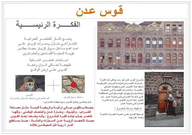 أوضح رئيس مؤسسة أكس عدن الناشط المجتمعي سامي العدني بأن المجسم الذي يجري إنشاءه حالياً بمثلث البنك الأهلي بمديرية صيرة يرمز إلى الثرات العمراني للمدينة التاريخية.
