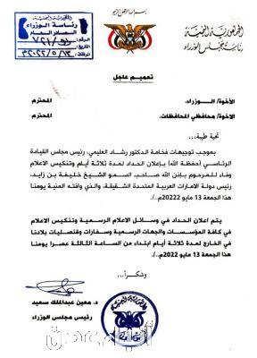 السلطة المحلية بالعاصمة عدن تعلن الحداد وتنكيس الإعلام لثلاثة أيام وفاءً لسمو الشيخ خليفة بن زايد آل نهيان