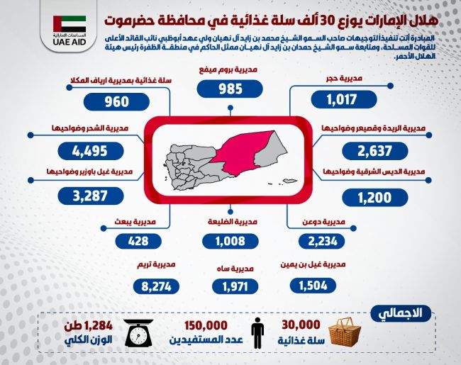 وزعت هيئة الهلال الأحمر الإماراتي، (8274) سلة غذائية من المير الرمضاني، لأهالي مديرية تريم بمحافظة حضرموت،  تزن ( 354 طن و 127.2 كيلو جراماً)  شاملة الأصناف الأساسية. وذلك في
