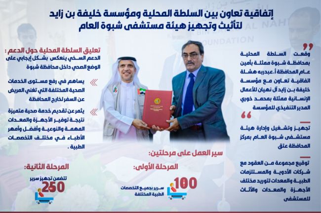 وقعت السلطة المحلية بمحافظة شبوة ممثلة بأمين عام المحافظة أ.عبدربه هشلة اتفاقية تعاون مع مؤسسة خليفة بن زايد آل نهيان للأعمال الإنسانية ممثلة بمحمد خوري المدير التنفيذي
