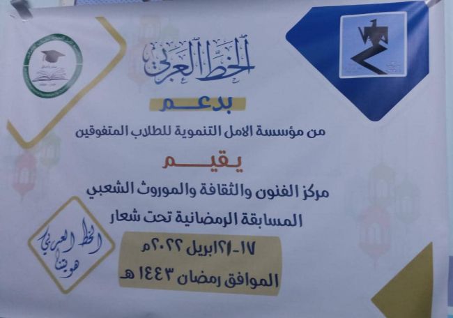 اختتمت مساء الخميس الموافق٢١ ابريل فعاليات حفل المسابقه الرمضانيه للخط العربي تحت شعار الخط العربي هويتنا بتنظيم مركز الفنون والثقافة و الموروث الشعبي