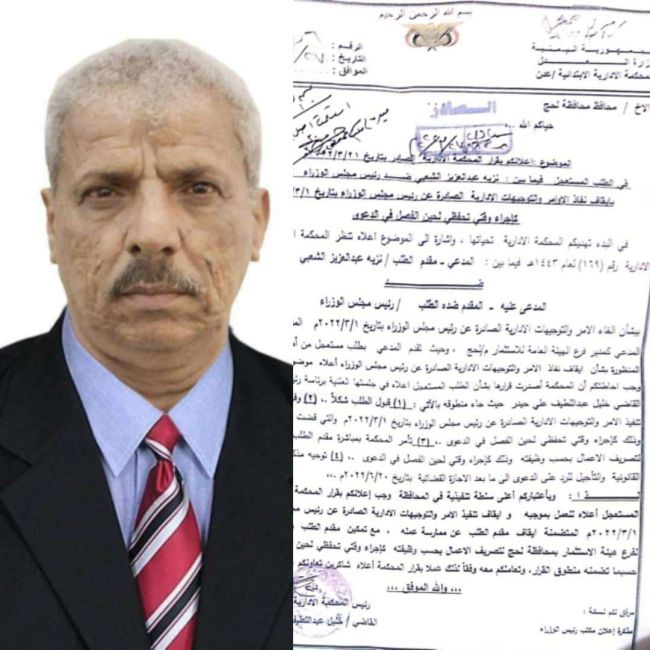 وجهت المحكمة الإدارية في العاصمة عدن مذكرة رسمية لمحافظ محافظة لحج أحمد عبدالله تركي تسلمها مدير مكتبه أمس الاول ، وطالبت المحكمة فيها المحافظ تركي بتنفيذ حكم المحكمة الصادر في الــ27 من مارس