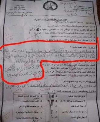 تحصل احد طلاب مرحلة الأول ثانوي بثانوية النهضة في الشيخ عثمان بعدن للعام الدراسي الحالي، 2021-2022 في امتحان مادة المجتمع على درجة 38 /60 مقابل حله لسؤال للنموذج "ب" يعرف مفهوم الحكومة
