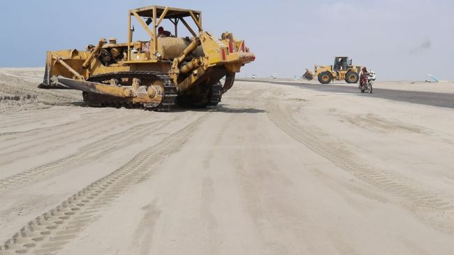 تستمر الفرق الفنية العاملة في خط العلم دوفس بمحافظة أبين ازاحة الرمال تفادياً للحوادث.