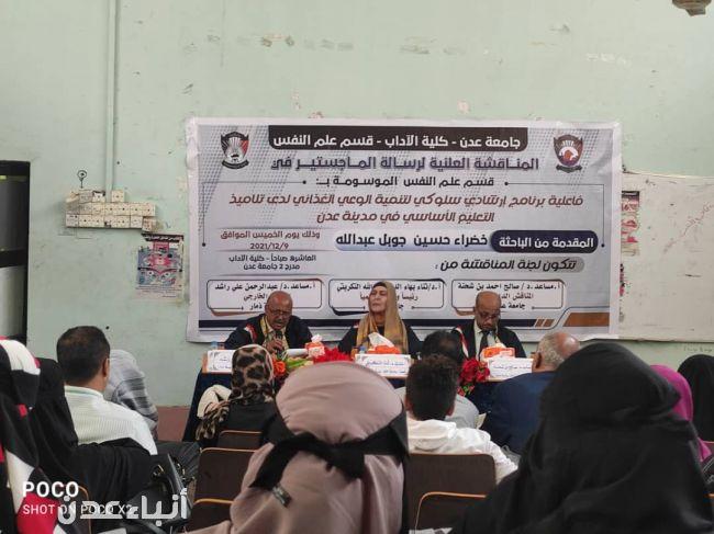 منحت جامعة عدن (كلية الآداب) قسم علم نفس، اليوم الخميس، درجة الماجستير بامتياز للطالبة خضراء حسين جوبل، عن رسالتها "فاعلية برنامج إرشادي سلوكي لتنمية الوعي الغذائي لدى تلاميذ