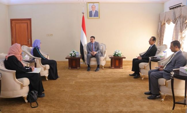 خلال لقاء وزير الخارجية أحمد بن مبارك، مع رئيسة بعثة اللجنة الدولية للصليب الأحمر لدى اليمن كاترينا ريتز، في عدن.