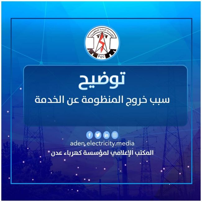 توضح المؤسسة العامة لكهرباء عدن بأن أثناء رفع التوليد للتوربين رقم 1 بمحطة الرئيس بطاقته الكاملة 110 ميجا وات وإدخاله في الخدمة تسبب ذلك بخلل في عمل المنظومة مما أدى إلى خروج كافة محطات
