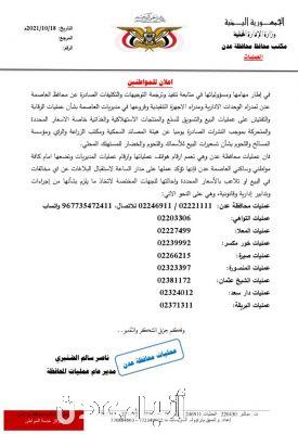 عمليات محافظة عدن تعيد نشر ارقام هواتفها وهواتف عمليات المديريات لمواطني وساكني العاصمة عدن وتؤكد عملها على مدار الساعة لاستقبال بلاغات المواطنين حول اي عمليات مخالفة او تلاعب بالاسعار