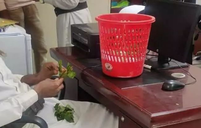 ويظهر في الصور موظف يتعاطى القات داخل قسم التسجيل بجامعة إقليم سبأ في مشهد غريب.