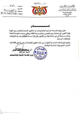 *الخدمة المدنية تعلن الخميس إجازة رسمية بمناسبة ذكرى ثورة 14 أكتوبر*