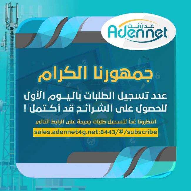 قال مصدر مطلع أن الموقع الالكتروني الذي أطلقته شركة عدن نت اليوم استقبل الآلاف من المتقدمين لشراء شريحة عدن نت .