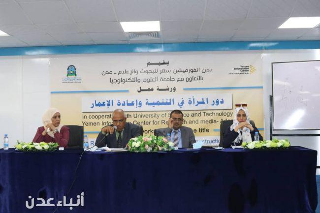 نظم مركز يمن انفورميشن سنتر للبحوث والإعلام ـ عدن ، بالتعاون مع جامعة العلوم والتكنولوجيا ، اليوم ، ورشة عمل خاصة بـ"دور المرأة في التنمية و إعادة الإعمار" ، بمشاركة 72 من أكاديميين