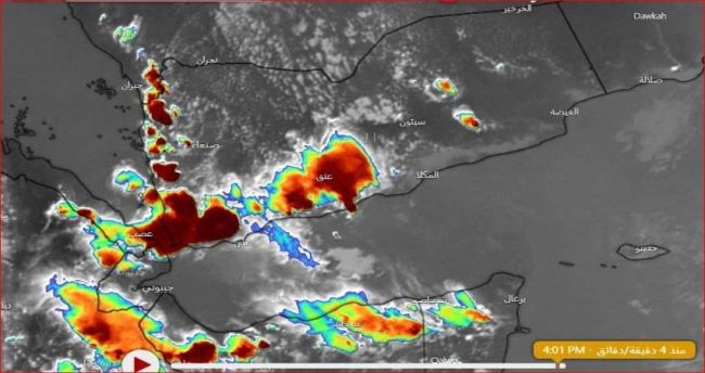 حذرت مراكز الارصاد الجوية في اليمن من استمرار حالة عدم الاستقرار في الأجواء خلال اليومين القادمين والتي يرافقها سحب كثيفة واسعة الانتشار مع هطول امطار غزيرة على مناطق واسعة من