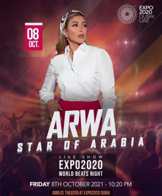 تحيي الفنانة أروى الليلة 8 أكتوبر2021 حفلاً فني ضمن فعاليات المهرجان الأول من إيقاعات إكسبو الذي ينطلق بعنوان "إيقاعات العالم World Beats "