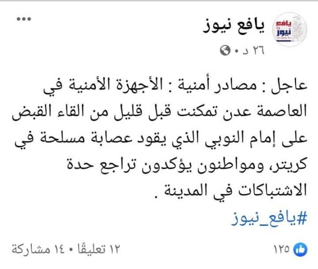 قالت مصادر أمنية وفقا لموقع يافع نيوز إن الأجهزة الأمنية في العاصمة عدن تمكنت قبل قليل من القاء القبض على إمام النوبي الذي يقود عصابة مسلحة في كريتر، ومواطنون يؤكدون تراجع حدة الاشتباكات في