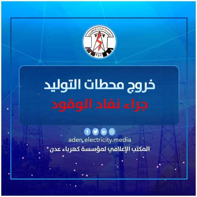 تنوه المؤسسة العامة لكهرباء عدن عن بدء الخروج التدريجي لعدد من محطات التوليد بسبب نفاد وقود الديزل.