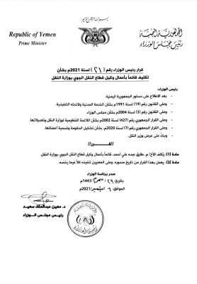 أصدر دولة رئيس مجلس الوزراء اليوم قرار رقم (٢١) لسنة ٢٠٢١م ، و بناء على عرض وزير النقل قضى: بتكليف