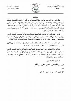 نعى حزب رابطه الجنوب العربي الحر، وفاة الشخصية الوطنية العميد عبدالله احمد الحوتري المرقشي، نائب القائم باعمال الامين العام لحزب الرابطه، رئيس
