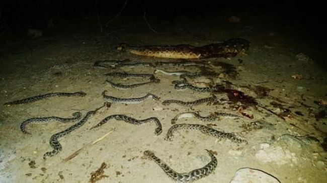 وعقب القضاء على الافعى خرج من بطنها عشرات الافاعي الصغيرة