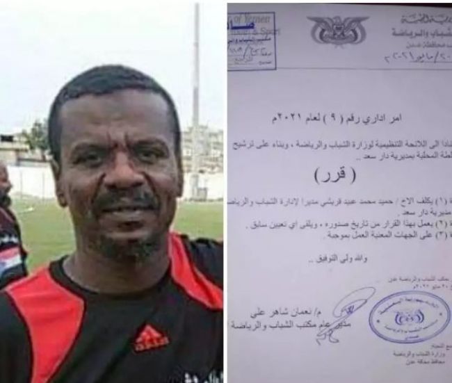 أصدر المهندس نعمان شاهر علي مدير عام مكتب الشباب والرياضة بعدن القرار الإداري رقم ( 9 ) لسنة 2021م استناداً إلى اللائحة التنظيمية لوزارة الشباب والرياضة، وبناء على ترشيح من السلطة