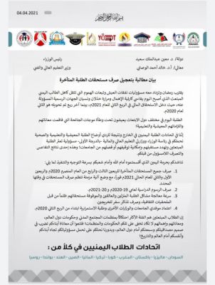 حمل طلاب اليمن المبتعثين في دول الابتعاث دولة رئيس الوزراء الدكتور/ معين عبدالملك، ووزير التعليم العالي والفني الدكتور/ خالد أحمد الوصابي المسؤولية الكاملة نتيجة